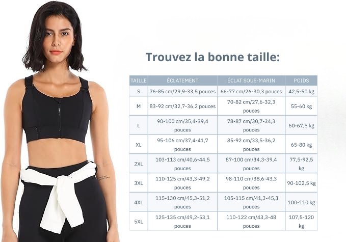 Consultez notre guide des tailles juste au-dessus du bouton d’achat. Prenez votre tour de poitrine et votre tour sous-poitrine à l’aide d’un mètre ruban, puis référez-vous au tableau pour trouver la taille la plus adaptée.